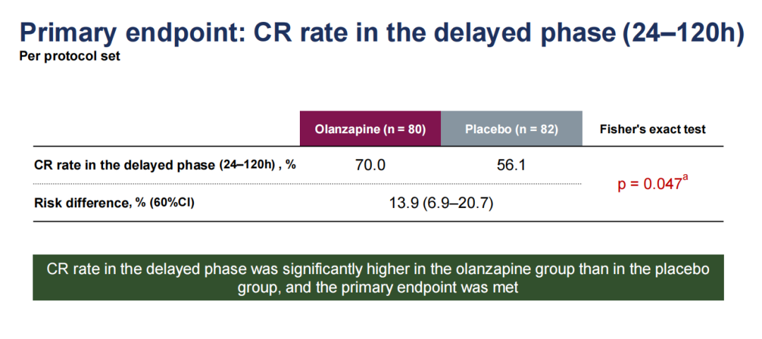 2021年11月至2023年9月期间,日本43家研究中心共纳入168例患者,其中162例(80例OLZ,82例PBO)纳入按方案分析集。本研究达到了主要终点,即OLZ组的延迟期CR显著高于PBO组(70.0%vs 56.1%,P=0.047;差异(diff):13.9%,60%CI:6.9~20.7)。