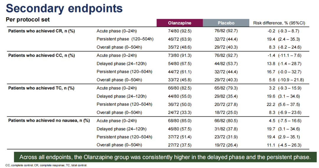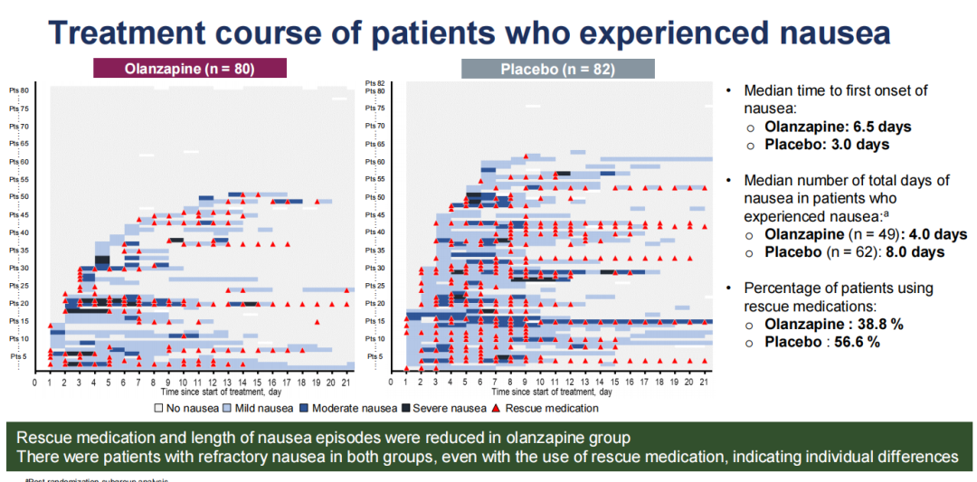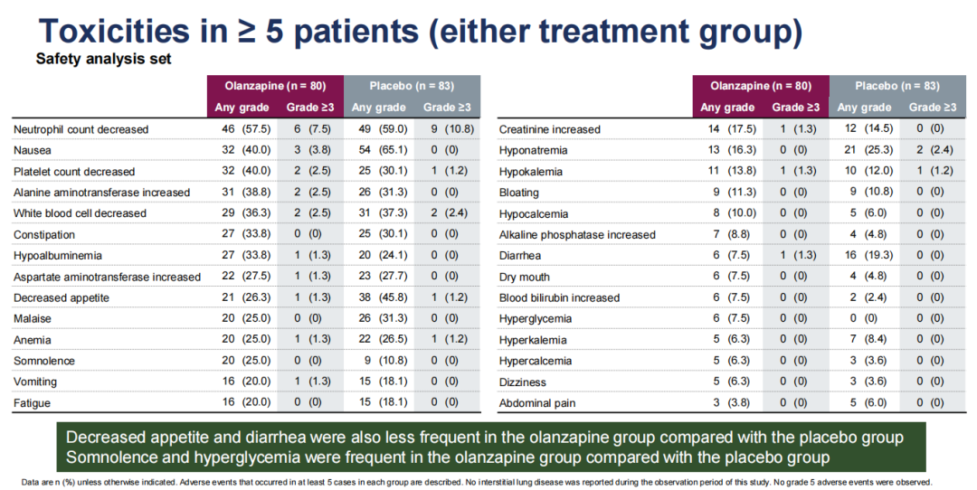 首个周期内,OLZ组的恶心总天数少于PBO组(4.0天vs 8.0天,P=0.033)。OLZ组的食欲减退发生率也低于PBO组(任何级别:60.0%vs 80.7%,P=0.006)。OLZ组还观察到高血糖和嗜睡,但多为低级别。