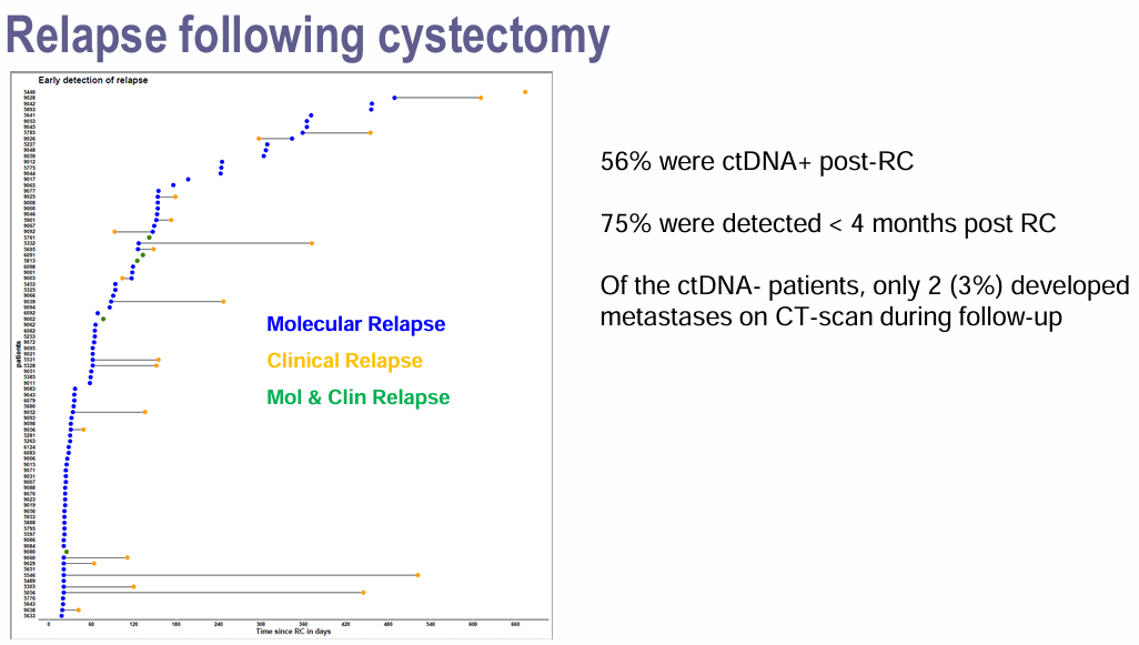 新辅助化疗及根治性膀胱切除术后连续的ctDNA检测是一种高度特异性的方法,可用于识别转移性疾病较小时,可能受益于早期免疫治疗的膀胱癌患者。目前而言,这是第一份连续ctDNA测量用于指导膀胱癌的治疗决策的临床试验数据分析。