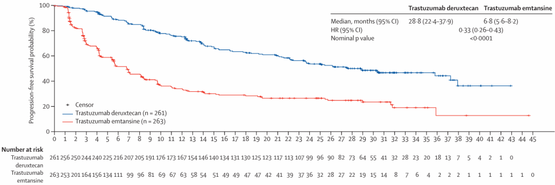 [1].Cortés J,Kim SB,Chung WP,et al.LBA1 Trastuzumab deruxtecan(T-DXd)vs trastuzumab emtansine(T-DM1)in patients(Pts)with HER2+metastatic breast cancer(mBC):Results of the randomized phase III DESTINY-Breast03 study.Ann Oncol 2021;32:S1287-S1288.