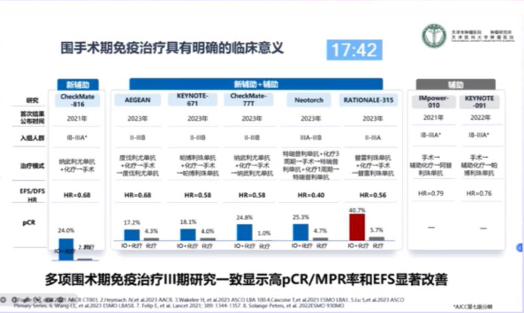 王长利教授表示,2024年步入了非小细胞肺癌(NSCLC)围手术期免疫治疗元年,5项围手术期免疫治疗适应症获批,多项围手术期免疫治疗Ⅲ期研究结果证实其有明确的临床意义: