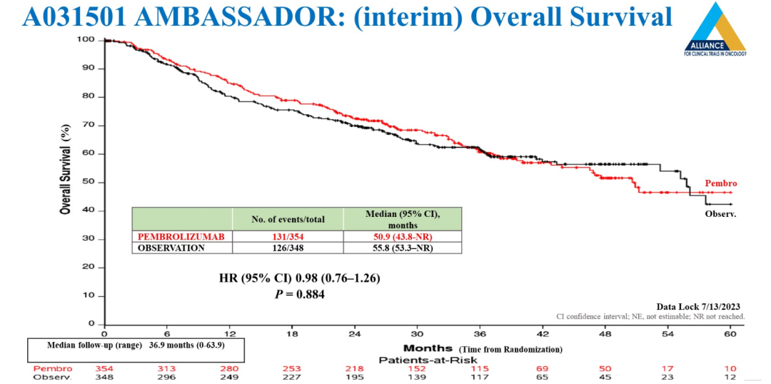 AMBASSADOR研究是另一个ICI辅助治疗MIBC的III期研究。该研究入组患者为新辅助化疗后≥pT2和/或pN+/切缘阳性,以及不适合或拒绝新辅助化疗的≥pT3和/或pN+/切缘阳性患者,术后接受帕博利珠单抗或安慰剂辅助治疗1年。2024年ASCO-GU大会报道达到了研究的主要终点之一DFS:帕博利珠单抗组和对照组的中位DFS分别为29.0个月和14.0个月(HR 0.69,95%CI 0.54~0.87,P=0.001)。但另一个主要终点OS尚无显著差异(50.9 vs 55.8个月,HR 0.98,95%CI:0.76~1.26;P=0.883)[10]