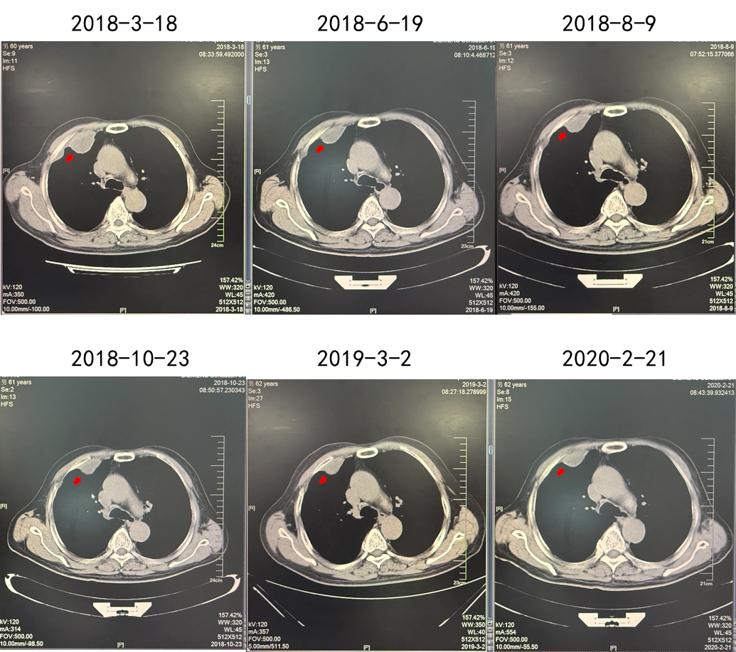 疗效:肺部病灶疾病稳定(4年)。对侧肾上腺病灶部分缓解(4年)。