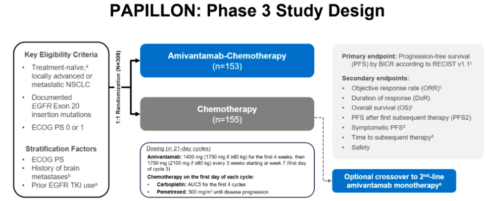 PAPILLON研究是一项全球多中心、随机对照III期临床研究,旨在评估埃万妥单抗联合化疗(ACP方案)与单纯化疗在EGFR ex20ins突变晚期或转移性NSCLC患者一线治疗中的疗效和安全性[6]。主要终点是根据盲态独立中心评估(BICR)评估的无疾病进展生存期(PFS),关键次要终点包括客观缓解率(ORR)、总生存期(OS)及中位缓解持续时间(DoR)等。