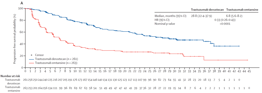 对于H耐药人群,新型ADC带来了优越的疗效呈现。DESTINY-Breast03研究[2,3]对于H耐药患者患者进行了T-DXd与恩美曲妥珠单抗(T-DM1)的对比,结果显示T-DXd较T-DM1大幅提升了中位无进展生存期(PFS),为28.8个月vs 6.8个月(HR 0.33,95%CI 0.26-.043,nominal P<0.0001)(图1),并显著延长了中位无进展生存期(mOS 52.6个月和42.7个月;HR=0.73,95%CI 0.56-0.94)。