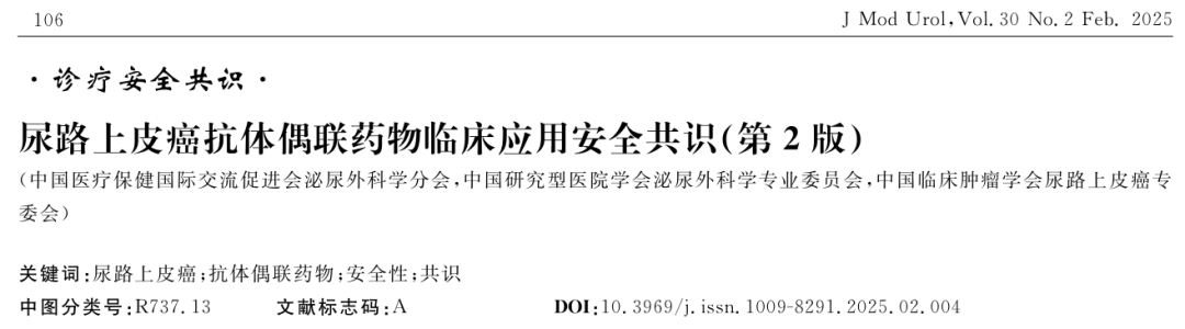 中国医疗保健国际交流促进会泌尿外科学分会,中国研究型医院学会泌尿外科学专业委员会,中国临床肿瘤学会尿路上皮癌专委会.尿路上皮癌抗体偶联药物临床应用安全共识(第2版)[J].现代泌尿外科杂志,2025,30(2):106-117.