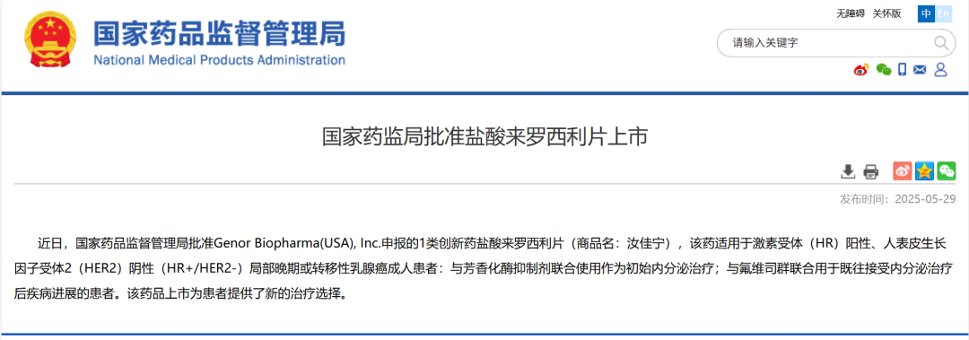 编者按:2025年5月29日,国家药品监督管理局(NMPA)同时批准了来罗西利(Lerociclib)用于激素受体(HR)阳性、人表皮生长因子受体2(HER2)阴性(HR+/HER2-)局部晚期或转移性乳腺癌成人患者的一线和二线适应症,适用于与芳香化酶抑制剂联合使用作为初始内分泌治疗;以及与氟维司群联合用于既往接受内分泌治疗后疾病进展的患者。此次获批主要是基于全国多中心III期临床研究LEONARDA-1的积极结果[1],这一适应症的获批标志着中国在HR+/HER2-乳腺癌靶向治疗领域又迈出重要一步,也为这类患者带来了疗效与安全性俱佳的新治疗选择。值此之际,肿瘤瞭望特邀浙江大学医学院附属第二医院黄建教授对来罗西利在HR+乳腺癌领域的应用发表真知灼见,以飨读者。