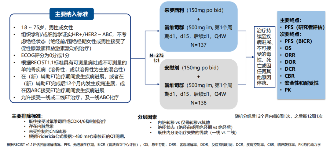 III期LEONARDA-1研究评估了来罗西利联合氟维司群在治疗内分泌耐药的HR+/HER2-晚期乳腺癌患者中的疗效和安全性。研究纳入了275例既往接受过一线或二线内分泌治疗进展的HR+/HER2-局部晚期或转移性乳腺癌患者,按1:1分配至来罗西利联合氟维司群组或安慰剂联合氟维司群组,主要研究终点是研究者评估的无进展生存期(PFS),次要研究终点是盲态独立中心(BICR)评估的PFS、总生存期(OS)、客观缓解率(ORR)、持续缓解时间(DoR)、疾病控制率(DCR)、临床获益率(CBR)、安全性和耐受性以及药代动力学等[1]