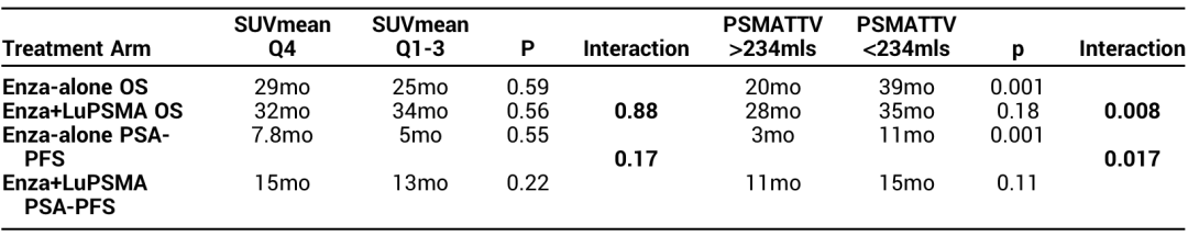 恩扎卢胺单药治疗中,SUVmean Q4 vs Q1-3的中位OS分别为29个月vs 25个月(P=0.59)。恩扎卢胺+LuPSMA联合治疗中,SUVmean Q4 vs Q1-3的中位OS分别为32个月vs 34个月(P=0.56)。SUVmean(Q4 vs Q1-3)与OS治疗方案交互作用检验结果为P=0.88。PSA-PFS结果也列于下表。