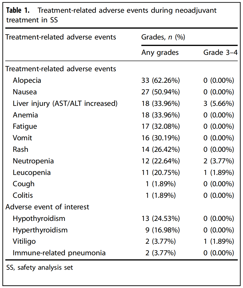 在安全性方面,90.57%(48/53)的患者经历了至少一次治疗相关不良事件(TRAEs),其中11.32%(6/53)为≥3级不良事件,包括肝损伤和中性粒细胞缺乏。最常见的免疫相关不良反应是甲减和甲亢。