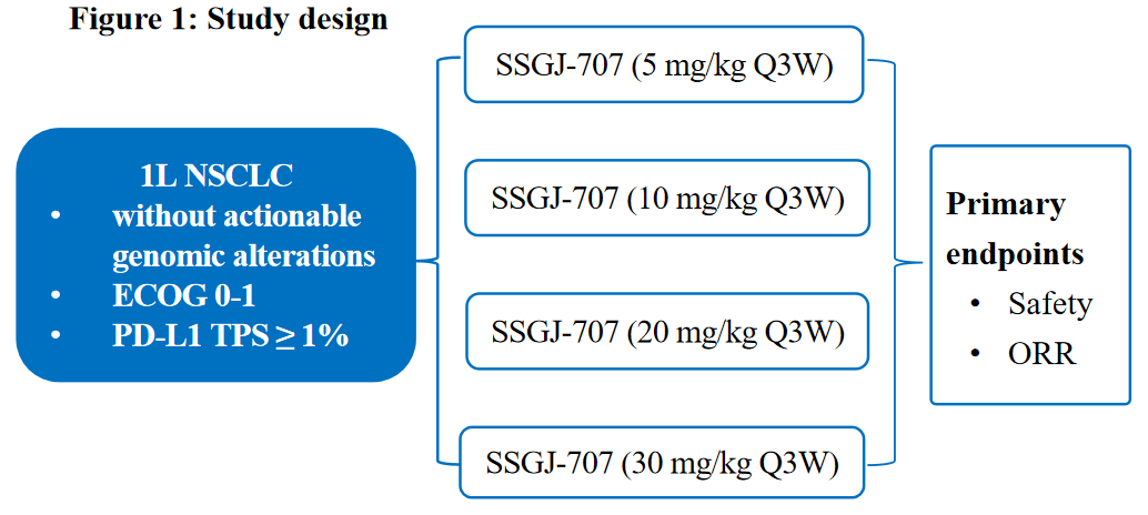 这是一项开放、多中心II期研究,旨在评估SSGJ-707单药治疗晚期NSCLC患者的安全性和有效性(SSGJ-707-NSCLC-II-01,NCT06361927)。入组患者为晚期初治(PD-L1表达阳性且驱动基因阴性)的NSCLC,入组后接受SSGJ-707单药治疗,直到发生疾病进展或不可耐受毒性。