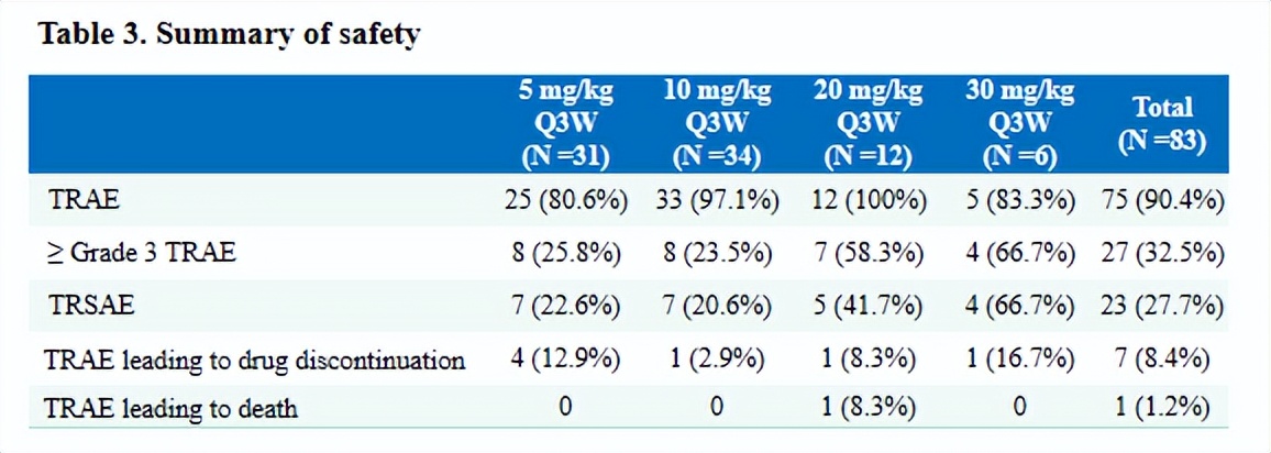 SSGJ-707 10mg/kg Q3W最常见的TRAEs(≥10%的患者)包括天冬氨酸转氨酶升高、丙氨酸转氨酶升高、蛋白尿、甲状腺功能减退、高甘油三酯血症、高胆固醇血症、低钙血症、咯血和高血压(图4)。