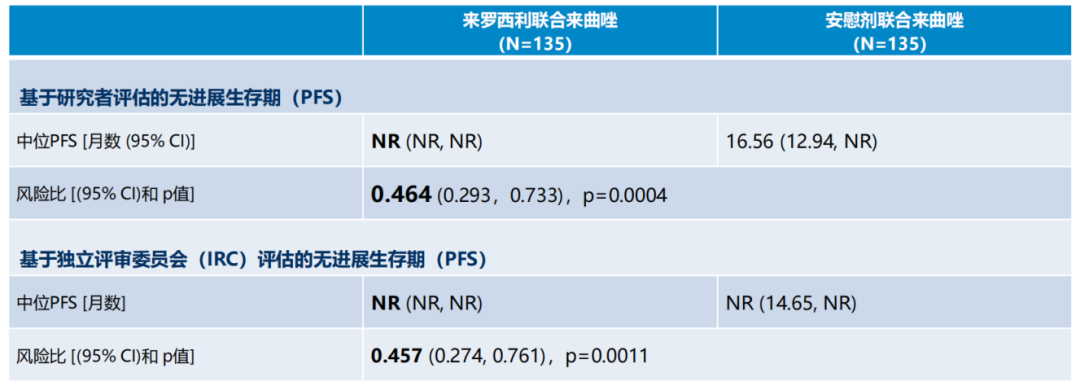 从2024年ASCO大会报道的数据[10]来看,该研究已经达到预设的期中分析疗效统计学显著差异要求,来罗西利+来曲唑组和来曲唑组研究者评估的PFS分别为NR和16.56个月,疾病进展或死亡风险显著降低53.6%(HR 0.464,P=0.0004);IRC评估的PFS也保持一致获益(HR 0.457,P=0.0011)。而且从已报道的CDK4/6i一线治疗研究来看,来罗西利的HR(0.4464)同样位于较低水平,患者的PFS获益幅度非常大。