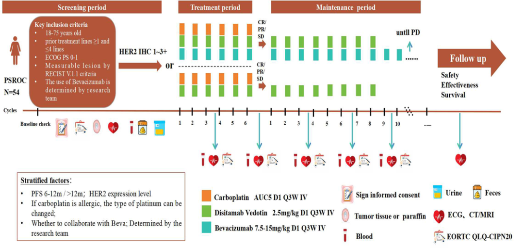 治疗期针对HER2 IHC 1+~3+的患者,采用卡铂(AUC5,D1,Q3W,IV)联合维迪西妥单抗(2.5mg/kg,D1,Q3W,IV)治疗方案,根据临床实践情况由研究团队决定是否联合贝伐珠单抗(7.5-15mg/kg,D1,Q3W,IV)。若达到完全缓解(CR)、部分缓解(PR)或疾病稳定(SD),则进入维持治疗直至疾病进展(PD)。主要终点是PFS,次要终点包括客观缓解率(ORR)、疾病控制率(DCR)、OS和安全性结果。一个探索性终点为患者报告的生活质量(EORTCOLQ-CIPN20)。