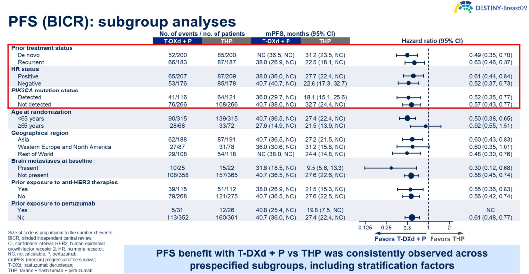亚组分析显示,不同患者均有一致的PFS获益。基线患者有超过43%的患者接受过(新)辅助治疗,有大约30%的患者存在PIK3CA突变,有大约54%的患者为HR+(即三阳性乳腺癌);而亚组显示初诊(HR 0.49)或复发(HR 0.63)患者、HR+(HR 0.61)或HR-(HR 0.52)患者、有(HR 0.52)或无PIK3CA突变(HR 0.57)患者均有一致的PFS获益。