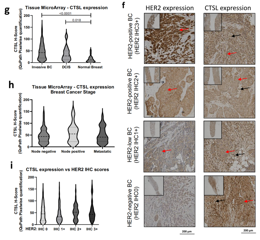 传统ADC的疗效高度依赖靶抗原介导的内化及溶酶体降解,但T-DXd在HER2-low/ultralow肿瘤中的活性提示存在非经典途径。该研究首次证实,T-DXd的连接子可被肿瘤微环境(TME)中高表达的组织蛋白酶L(CTSL)在细胞外直接裂解,释放强效的DXd载荷。这一过程独立于HER2结合:在HER2阴性乳腺癌模型(如MDA-MB-468)中,CTSL敲除显著降低肿瘤内DXd浓度及治疗效果,而临床样本分析显示,侵袭性乳腺癌(无论HER2状态)的肿瘤细胞及间质成纤维细胞中CTSL表达显著高于正常组织。值得注意的是,CTSL在酸性微环境(如肿瘤细胞外基质)中活性增强,进一步优化了T-DXd的局部药物释放效率。这种机制突破了传统“旁观者效应”对邻近HER2阳性细胞的依赖,使T-DXd能够直接作用于HER2-low/阴性肿瘤,甚至无需HER2信号参与。