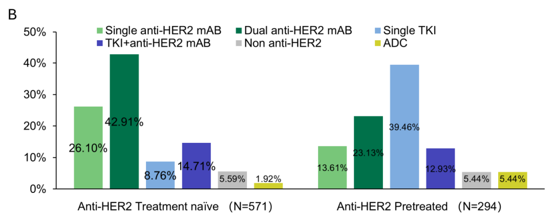 既往治疗是影响医生选择一线治疗的关键因素。图3显示了一线治疗选择的分布。在571例未经抗HER2治疗的患者中,mAB双靶治疗是最常见(42.91%)的一线选择;在294例抗HER2经治的患者中,最常见的治疗方案则是单药TKI(39.46%)和mAB双靶治疗(23.13%)。