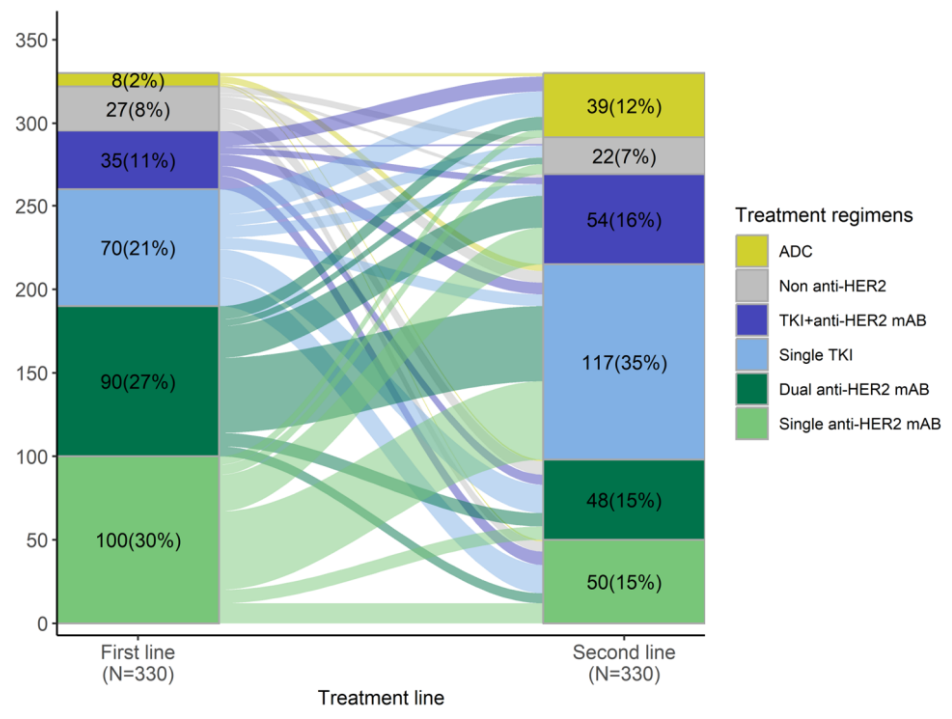 图2展示了从一线到二线的抗HER2治疗转换模式。在mAB单靶或双靶治疗后,最常用的治疗药物是TKI;而TKI治疗后,最常用的治疗药物是mAB单靶或双靶治疗、ADC。