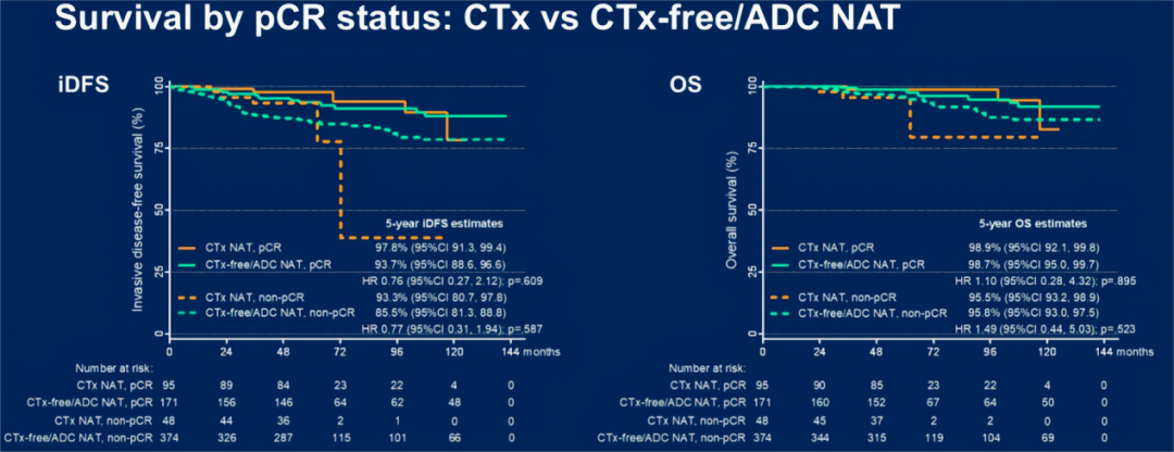 2025年ASCO大会公布的西德研究组(WSG)的ADAPT系列研究则探索了更激进的降阶梯策略。该研究对三项随机试验进行汇总分析,评估在曲妥珠单抗+帕妥珠单抗基础上完全豁免系统化疗的可行性。中位随访60.7个月的数据显示,化疗组与非化疗组的5年总生存率(98%vs 97%)和无浸润性疾病生存率(96%vs 88%)均无显著差异。值得注意的是,该研究入组患者多为I-II期且淋巴结阴性(约70%),提示对于这些低危患者,12周紫杉醇联合抗HER2药物可能是足够的治疗。