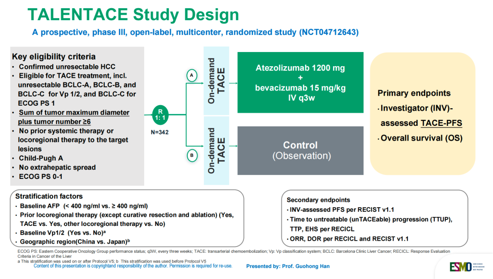 Jiahong Dong,Guohong Han,et al.TALENTACE:A phase III,open-label,randomized study of on-demand transarterial chemoembolization(TACE)combined with atezolizumab+bevacizumab(Atezo+Bev)or on-demand TACE alone in patients with systemically untreated,intermediate-to-high burden unresectable hepatocellular carcinoma(uHCC).ESMO GI 2025 Abstract:LBA2