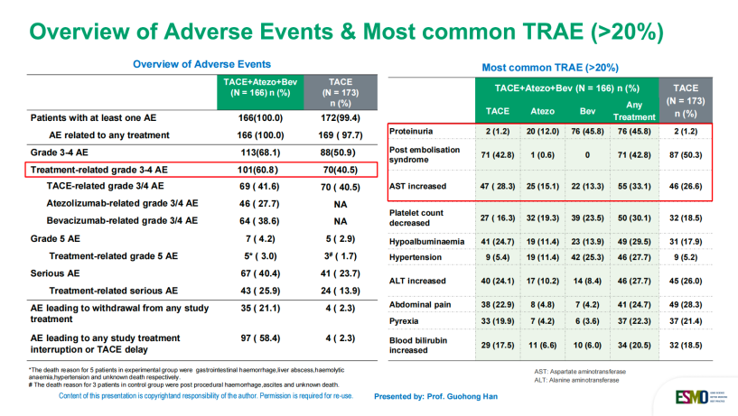 在安全性方面,联合治疗组的安全性特征与阿替利珠单抗、贝伐珠单抗及TACE的已知安全性一致,未发现新的安全性事件。联合治疗组治疗相关3-4级不良事件(AE)的发生率为60.8%,略高于单独TACE组的40.5%,但整体可控。最常见的AE包括高血压、蛋白尿、AST升高和血小板减少等,且大多数AE可通过标准管理措施进行控制。