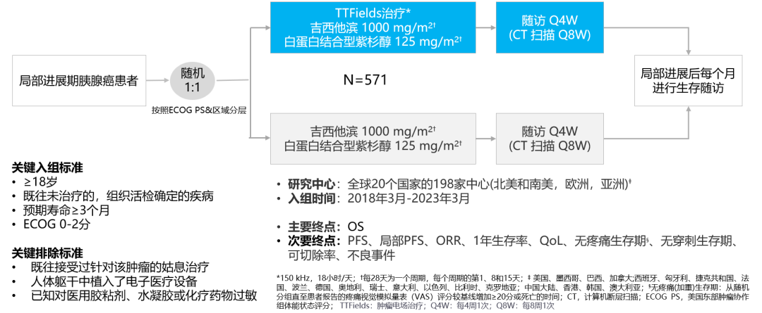 金钢教授:PANOVA-3研究是目前在局部晚期胰腺腺癌(LA-PAC)领域内规模最大的全球性、随机、开放标签、Ⅲ期临床研究,主要目的是评估肿瘤电场治疗(TTFields)联合吉西他滨和白蛋白结合型紫杉醇(GnP)治疗LA-PAC的疗效及安全性。研究将新诊断的571例LA-PAC成人患者按1:1比例随机分组,分别接受TTFields(150 kHz)联合GnP治疗或单独GnP治疗。主要终点为总生存期(OS),次要终点包括无进展生存期(PFS)、局部PFS、客观缓解率(ORR)、无疼痛生存期以及生活质量(QoL),事后分析包括远处PFS(图1)。