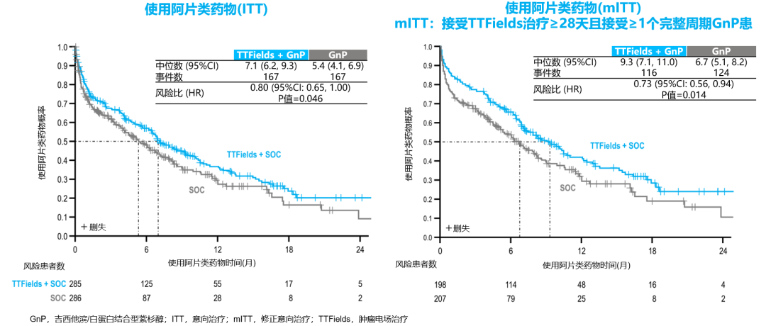 刚刚闭幕的ESMO GI大会上,公布了更详细的QoL数据和疼痛相关表现[2]:在疼痛管理方面,TTFields联合GnP治疗相对于GnP,中位疼痛无恶化时间和胰腺疼痛无恶化时间均得到了改善,中位疼痛无恶化时间为10.1 vs 7.4个月,P=0.003;中位胰腺疼痛无恶化时间为14.7 vs 10.2个月,P=0.006(图4),且显著推迟了首次使用阿片类药物的时间(7.1个月和5.4个月,P=0.046)(图5)。
