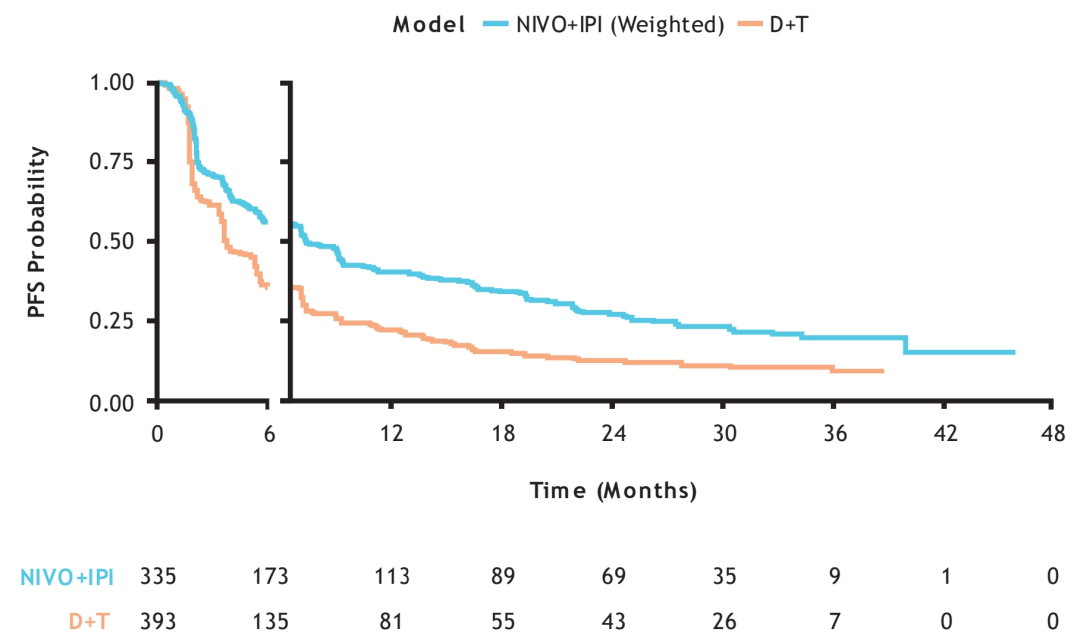 安全性方面(表3),N+I加权后的≥3级治疗相关不良事件(TRAEs)发生高于D+T(25.8%),但低于A+B(43.5%),治疗相关死亡率与两者相当。