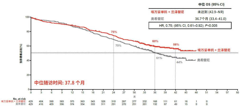 在今年欧洲肺癌大会(ELCC)公布的最终OS分析显示,埃万妥单抗+兰泽替尼的中位OS达到了具有统计学差异和临床意义的显著获益。相较奥希替尼组,埃万妥单抗联合兰泽替尼降低了25%的死亡风险,中位OS预期延长超过1年[11](图4),成为首个在III期研究中证实较奥希替尼单药在EGFR敏感突变一线NSCLC有OS显著改善的治疗方案。