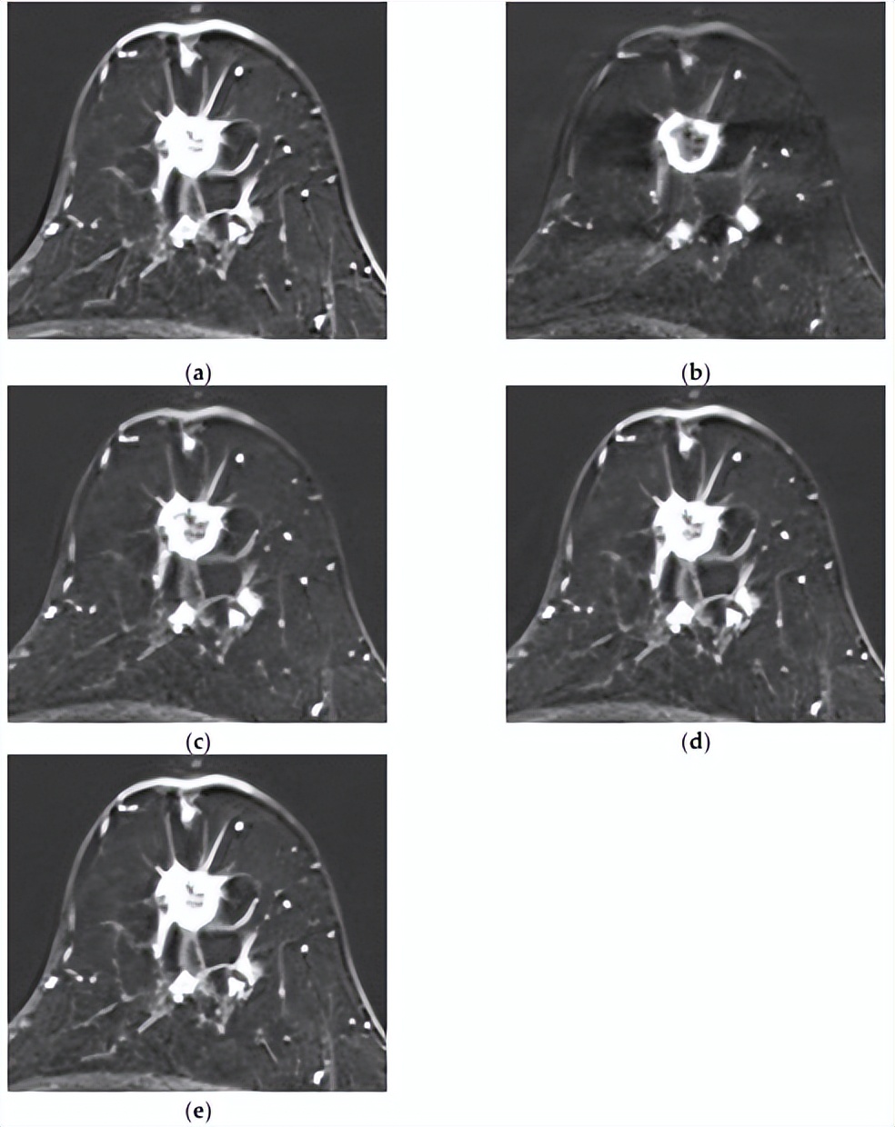 [MRI和组合模型均正确预测了复发。一名50岁女性,具有不均匀致密的纤维腺体组织和中度背景实质强化。注射对比剂后(a)1分钟、(b)2分钟、(c)3分钟、(d)4分钟和(e)5分钟的轴向增强T1加权MR图像显示,左乳房12点位置有一个1.8×1.6厘米的不规则形状、边缘有毛刺、边缘增强的肿块。在主要病变后方可见另一个8毫米增强肿块,侧面还有另外两个8毫米增强肿块,它们似乎相互连接。虽然图像中未显示,但上内象限存在另一个增强病变,证实了多中心疾病。两种模型均成功预测了该复发病例。]