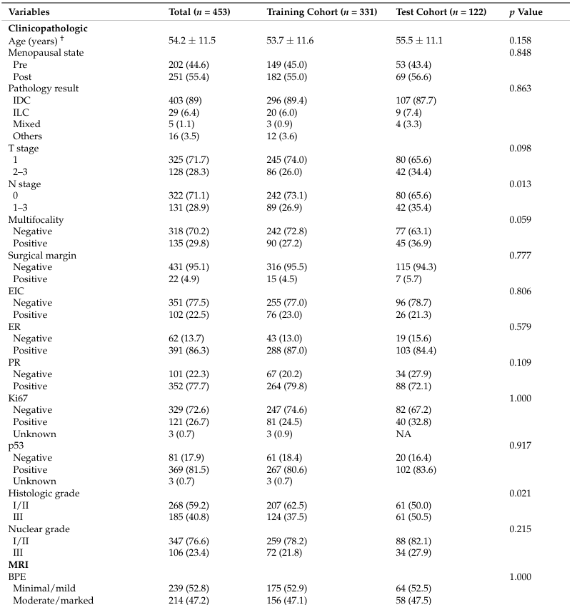 组织病理学诊断包括403例浸润性导管癌、29例浸润性小叶癌、5例混合性导管和小叶癌以及16例其他类型,训练组和测试组之间无显著差异。在临床病理变量中,N分期和组织学分级在训练组和测试组之间存在统计学显著差异。