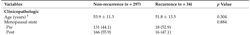 在训练队列的331例符合条件的患者中,34例出现复发,297例未出现复发。在临床病理变量中,复发患者的T分期(26.2%vs.50.0%,P=0.001)和N分期(22.6%vs.64.7%,P<0.000)高于未出现复发的患者。此外,复发组的多病灶肿瘤发生率(23.2%vs.61.8%,P<0.000)显著高于未出现复发的患者。并且,组织学特征为III级(33.7%vs.70.6%,P<0.000)和核特征为3级(18.5%vs.50.0%,P<0.000)的患者复发率更高。复发患者的孕激素受体(PR)阴性率也高于未复发患者(41.2%vs.17.8%,P=0.003)。相比之下,两组间雌激素受体(ER)状态或Ki-67指数无统计学显著差异。