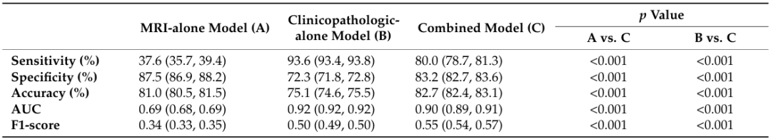 与MRI模型和临床病理模型相比,组合模型的所有性能改进均具有统计学意义(组间比较P<0.001)。