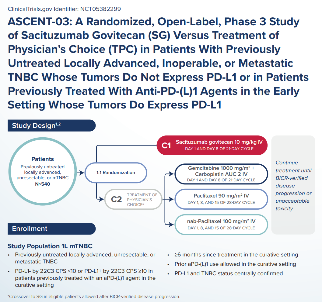 [14]Javier C.Cortés,et al.Primary Results From ASCENT-03:A Randomized Phase 3 Study of Sacituzumab Govitecan(SG)vs Chemotherapy(Chemo)in Patients(pts)With Previously Untreated Advanced Triple-Negative Breast Cancer(TNBC)Who Are Unable to Receive PD-(L)1 Inhibitors(PD-[L]1i).ESMO 2025;LBA20