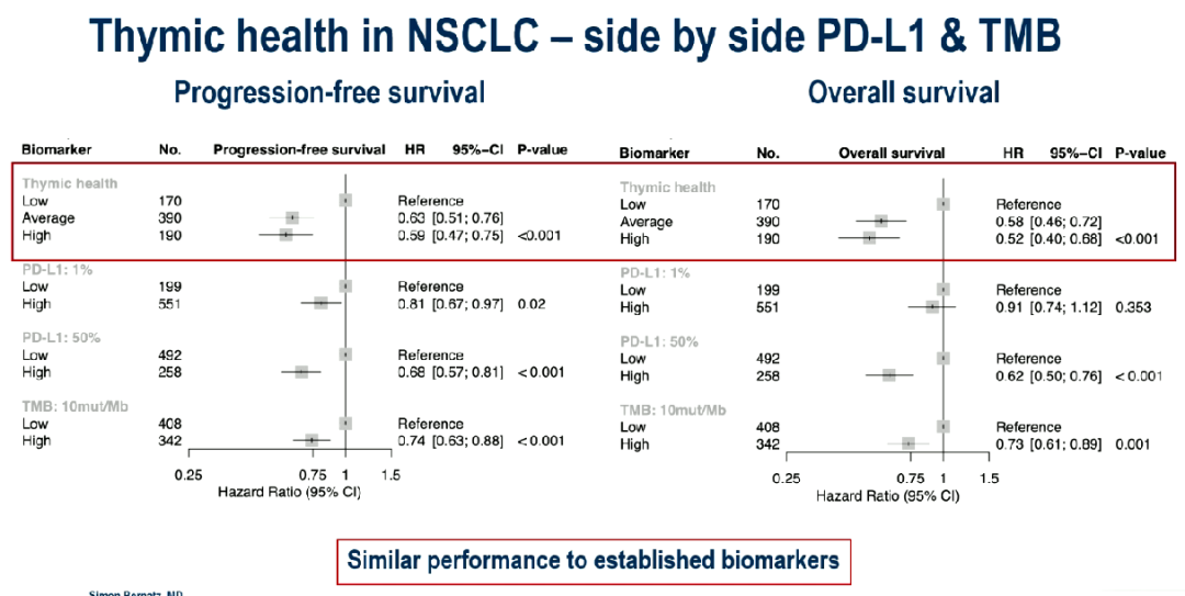 ☆胸腺健康与PFS/OS的相关性在不同PD-L1表达水平和肿瘤突变负荷(TMB)的患者分层中均存在。