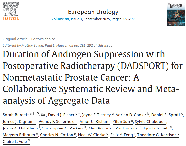Burdett S,Fisher D J,Tierney J F,et al.Duration of Androgen Suppression with Postoperative Radiotherapy(DADSPORT)for Nonmetastatic Prostate Cancer:A Collaborative Systematic Review and Meta-analysis of Aggregate Data[J].European Urology,2025.