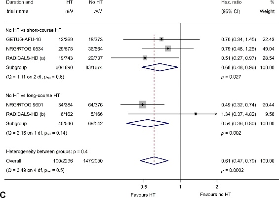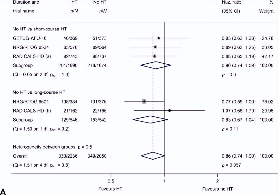 基于4286名患者和247例事件(占所有死亡病例的三分之一),前列腺癌特异性生存(PCSS)的HR为0.61(95%CI=0.47-0.79,P<0.001)。这意味着8年时PCSS的估计绝对改善为4%(95%CI=2%-5%),从90%增至94%。各试验结果大致一致(异质性P=0.5),随机效应模型的结果也相似(HR=0.61,95%CI=0.43–0.87,P=0.02)。短期内分泌治疗(3364名患者,143起事件;HR=0.68,95%CI=0.48–0.96,P=0.03)和长期内分泌治疗(1088名患者,109起事件;HR=0.54,95%CI=0.36–0.80,P=0.002;组间差异检验P=0.4)之间的疗效差异尚无明确证据。