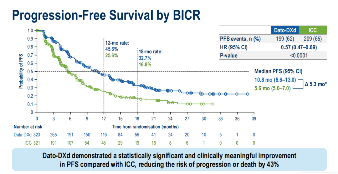 研究结果显示,Dato-DXd组BICR评估的中位PFS达到10.8个月,显著长于化疗组的5.6个月,疾病进展或复发风险降低43%[HR 0.57(95%CI:0.47-0.69);P<0.0001]。