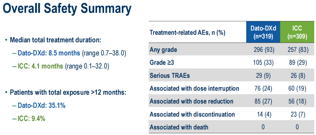 而TB-02研究正是针对不适合免疫治疗mTNBC患者,比较Dato-DXd和传统化疗一线治疗的国际性、多中心、III期临床研究,研究主要分析结果在ESMO年会上,由研究全球PI Rebecca Dent教授进行口头报告,数据让人眼前一亮:Dato-DXd治疗不仅延长了患者中位无进展生存期(mPFS,10.8个月vs.5.6个月,HR 0.57,P<0.0001),还成功延长了患者mOS(23.7个月vs.18.7个月,HR 0.79,P=0.0291),使Dato-DXd成为应优先考虑的治疗选择。
