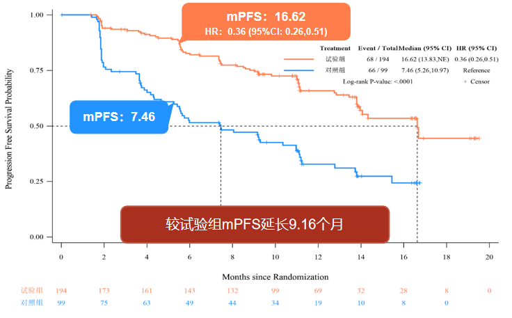 该研究两组患者基线水平分配平衡,平均年龄53岁,约42%处于绝经前或围绝经期,约59%存在内脏转移,34%.54%~41.41%存在≥3个转移灶累及器官,约21%既往内分泌治疗不敏感,约23%接受过解救化疗。中位随访13.77个月显示,库莫西利联合氟维司群组INV评估的mPFS为16.62个月,较氟维司群组的7.46个月显著延长9.16个月,疾病进展或死亡风险降低64%(HR=0.36,P<0.0001);IRC评估的mPFS获益也十分显著,为未达到vs 10.35个月(HR=0.42,P<0.0001),兼具统计学与临床双重意义。