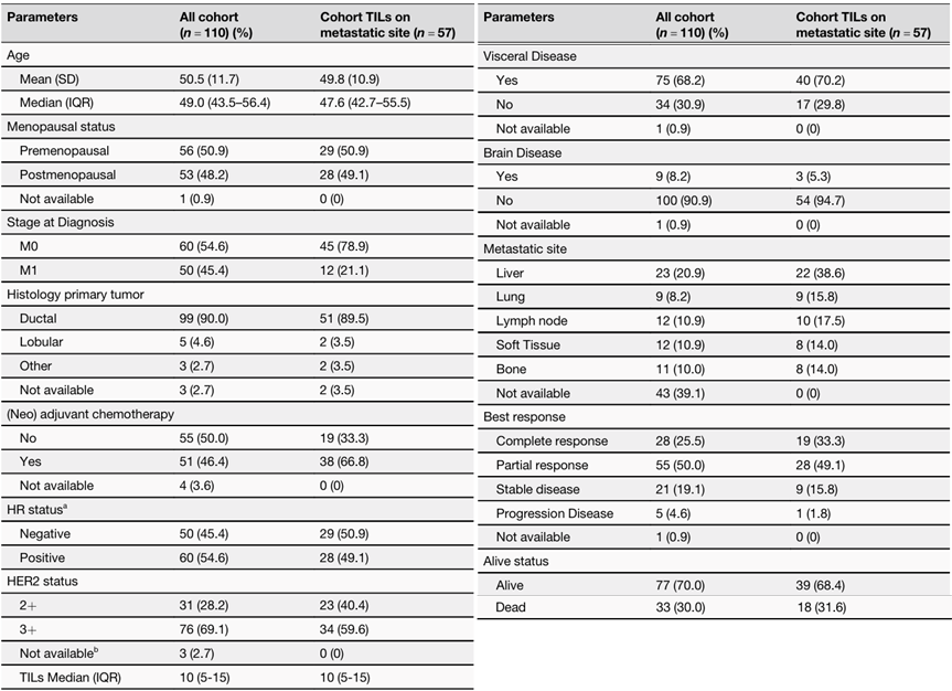 这项多中心回顾性研究纳入了2013年6月至2024年5月期间在欧洲肿瘤研究所和AOU Umberto I综合诊所接受治疗的110例HER2+mBC患者。采用苏木精-伊红染色切片对转移性乳腺癌(n=57)或原发性乳腺癌(n=53)样本的TIL水平进行评估。仅对一小部分患者(n=13)同时评估原发性肿瘤和转移性乳腺癌部位的TIL水平。