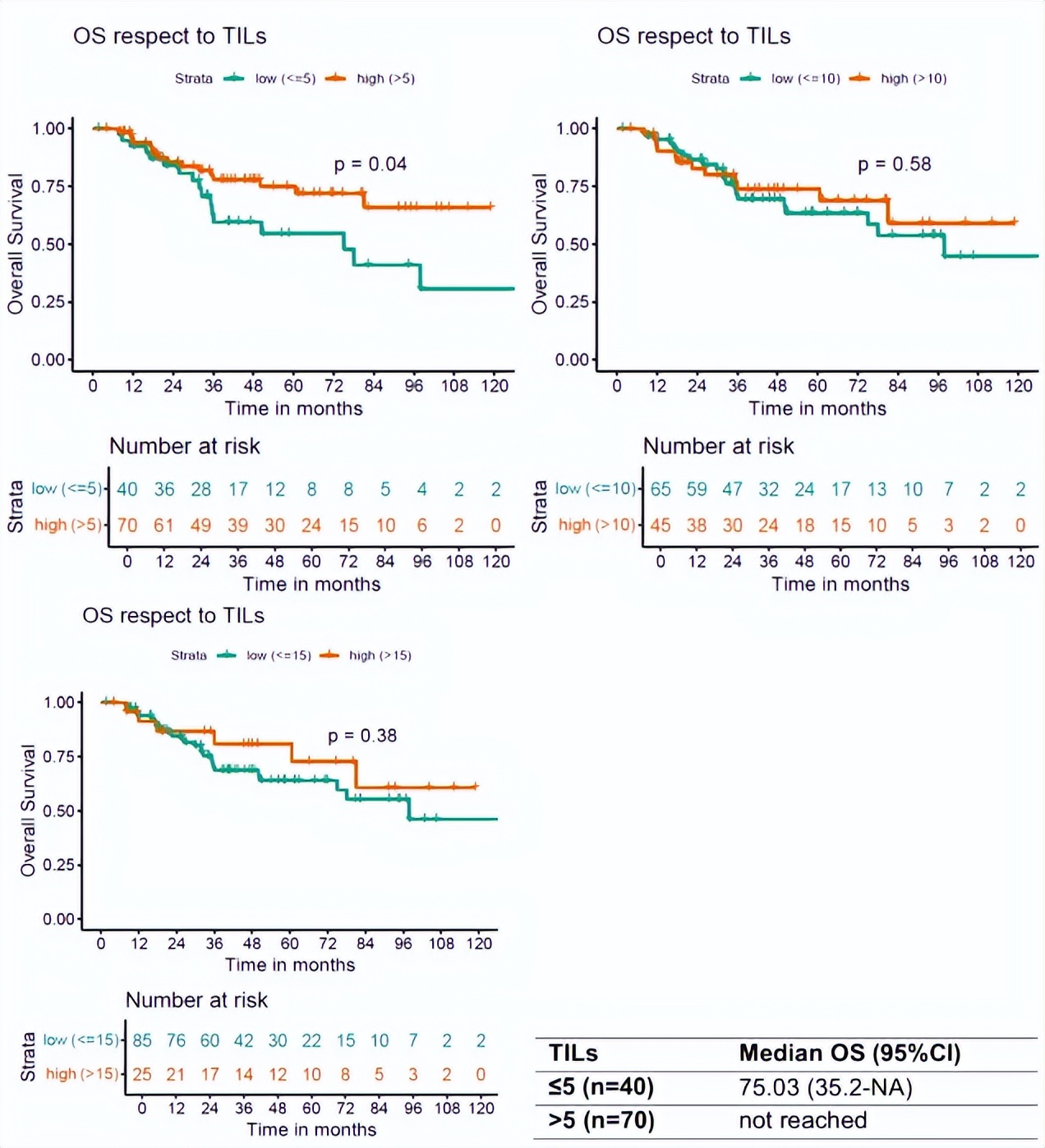 此外,TIL水平>5%的患者的中位OS显著长于TIL水平≤5%的患者。单变量分析显示,低TIL水平(≤5%)与OS较差相关(HR=3.18,P=0.021)。调整临床变量后,TIL与OS的关联处于统计学显著性极限值(HR=2.97,P=0.075),但在后续模型中,显著关联得到证实(HR=3.17,P=0.024)。作为连续变量(每增加10%),较高的TIL水平与更好的OS显著相关(HR=0.45,P=0.048)。在控制临床变量时,也观察到了类似的趋势,但未达到统计学意义(HR=0.44,P=0.104)。