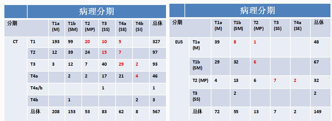术前精准分期是治疗决策的基础,在今年的ASCO上,韩国有一项研究旨在对比胃癌术后病理分期与术前CT/超声内镜分期,该研究回顾2012-2015年567例胃癌患者病历,对比术前术后分期情况,其中149例采用术前超声内镜分期。结果如下图所示,
