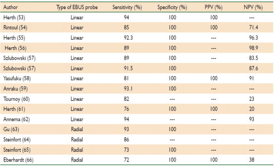 中华结核和呼吸杂志中有研究报道了46例初诊肺癌的EBUS-TNBA结果,显示EBUS-TNA的诊断敏感性为 96%,特异性为100%,阳性预测值为100%,阴性预测值为92%,准确率为 97%。表一列举了一系列研究中EBUS对肺癌诊断的敏感性(sensitivity),特异性(specidicity),阳性预测值(PPV),阴性预测值(NPV)的数据。足以见得EBUS及EBUS-TBNA(凸面超声探头结合专用的吸引活检针,实时超声引导下行经支气管针吸活检)对肺癌的辅助诊断可发挥重要作用。
