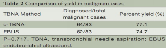 在一项肺癌诊断和分期的效果对比研究中,作者比较了TBNA及EBUS-TBNA对肺癌诊断和分期的效果。结果显示对肺癌诊断的阳性率,两者差异无统计学意义,但存在EBUS-TBNA较TBNA略低的趋势。因此EBUS - TBNA准确性引起了争议。
