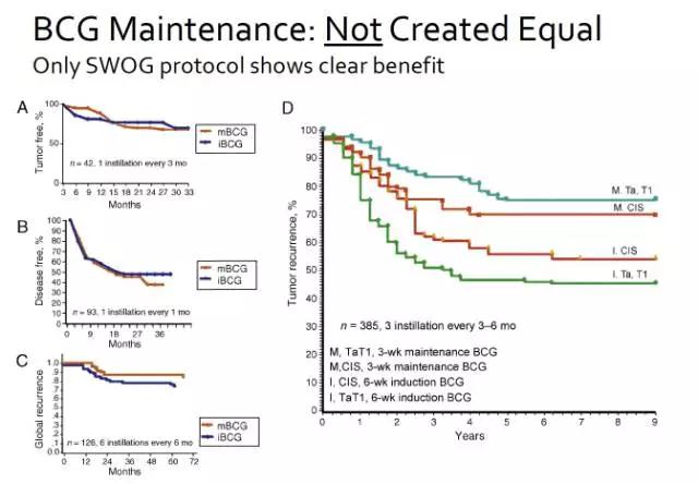 基于多项高质量的荟萃分析及随机对照临床试验,BCG不仅能减少疾病复发,还能降低27%进展为肌层浸润性膀胱癌的风险,但是这种获益是建立在使用诱导治疗+维持治疗方案之上的。然而有的研究者认为BCG维持治疗效果不佳,这种误解有可能是由于BCG治疗方案使用错误造成的,比如诱导治疗后每月1次灌注治疗或每3个月进行1次灌注治疗,最常见的错误是在治疗开始后的6个月时重复进行一次为期6周,每周1次的诱导治疗。