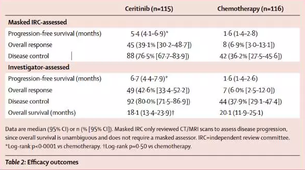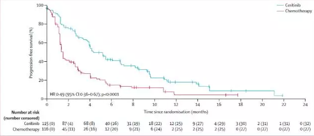 自2013年6月至2015年11月,研究1:1随机分配231例NSCLC患者进入色瑞替尼治疗组(n=115)和化疗组(n=116)。其中化疗组治疗药物有培美曲塞(34%)和多西他赛(63%),化疗组疾病进展患者可交叉进入色瑞替尼组。