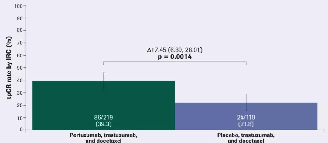 分析结果显示曲帕双靶组相对于对照组, tpCR显著提高,接近翻倍(39.3% vs 21.8% , P=0.0014),这一结果与NEOSPHERE研究结果高度一致。