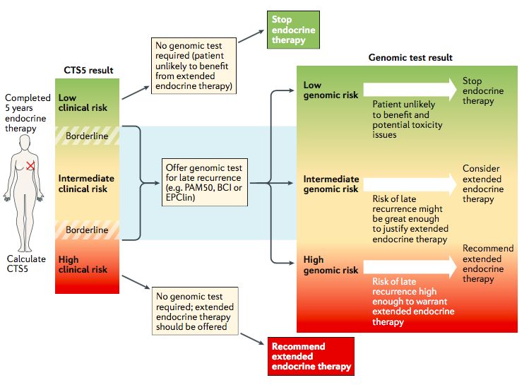 一些多基因检测工具,如Oncotype Dx 21基因、 IHC4、PAM50、EPclin 等,在预测复发风险方面均显示出一定的价值,但多基因检测更多的应用于早期复发风险的预测,而对远期风险的价值有待进一步证实。英国皇家马斯登医院Ralph Lauren乳腺癌研究中心(CTS5开发单位)的Richman教授提出了关于延长治疗的人群选择流程:对于CTS5低风险人群无需延长,高风险人群建议延长,而中风险人群则进一步通过多基因检测来明确风险,决定是否延长,可供参考(Fig.3)。