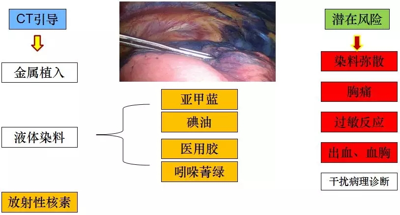 液体染料法则主要是通过亚甲蓝、碘油、医用胶及吲哚箐绿等染料而实现小结节的术前定位,这一方法首先在1994年由Lenglinger等在CT引导下注射亚甲蓝而实现,但这一方法存在染料弥散、胸痛、过敏反应、出血及干扰病理诊断等潜在风险。